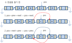 - 삭제할 요소의 다음 요소의 이전을 삭제할 요소의 이전을 가리키게 합니다.