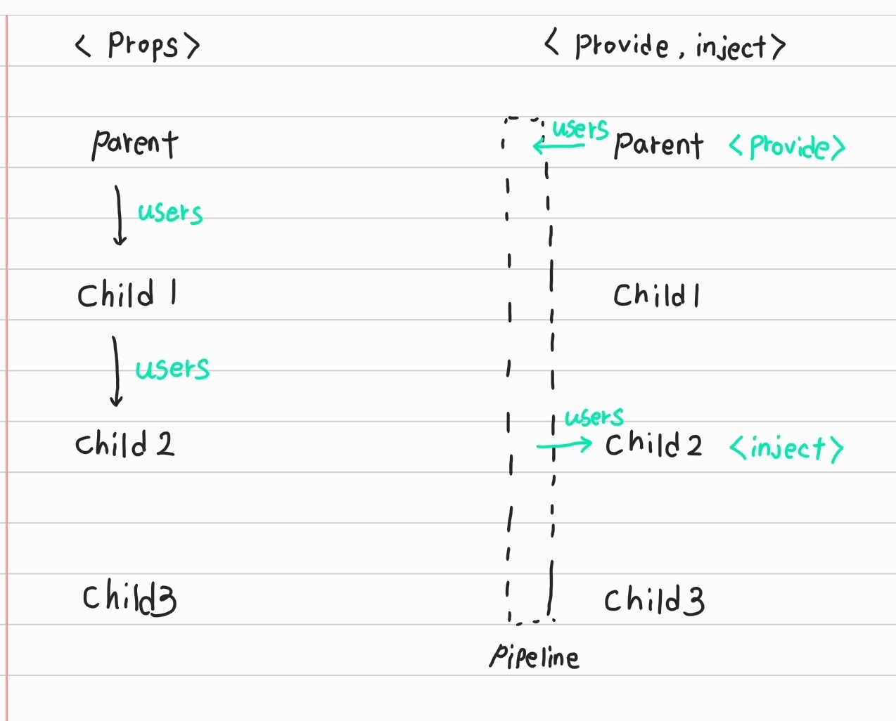 provide에 의해 생긴 파이프라인을 통해 data를 주고 받을 수 있게 되어, child1을 거치지 않고 child2에서 inject를 통해 users를 받을 수 있게 된다.