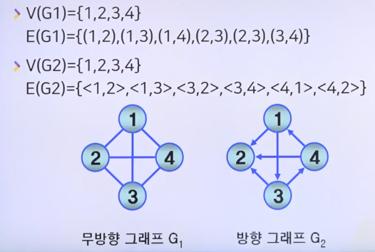 - 방향 그래프: 두 정점을 연결하는 간선이 방향성을 가지는 간선으로 연결된 그래프