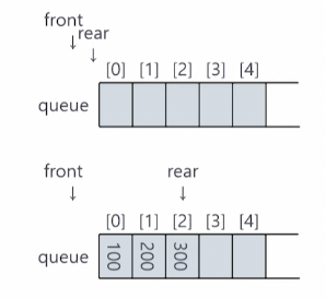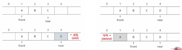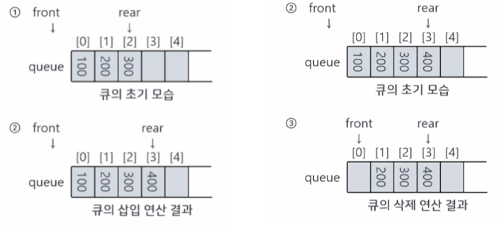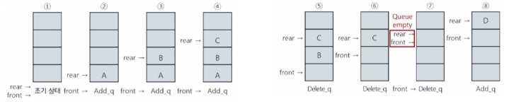 큐의 삽입: 삽입 연산이 발생하면 rear 변수만 오른쪽으로 이동하고, 삭제 연산이 발생하면 front 변수만 오른쪽으로 이동함