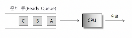FCFS(First-Come First-Served) 스케줄링(FIFO 스케줄링): 작업(프로그램)이 준비 큐에 도착한 순서대로 CPU를 할당받고 작업이 완료될 때까지 CPU를 사용하는 기법
