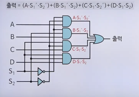- 여러 개의 입력선 중에서 하나를 선택하여 단일의 출력으로 내보내는 회로(데이터 선택기)