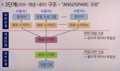 - 외부/개념 사상: 특정 외부 스키마와 개념 스키마 사이의 대응 관계를 정의 → 논리적 데이터 독립성