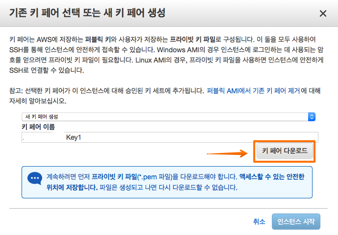 ‘키 페어 이름’에 키의 이름을 입력하고 [키 페어 다운로드] 버튼을 클릭해 키를 내려받습니다. 이 키는 인스턴스에 접근할 때 필요한 키이므로 잃어버리지 않도록 주의합니다. 키 파일을 내려받았다면 [인스턴스 시작] 버튼을 클릭해 인스턴스를 생성합니다.