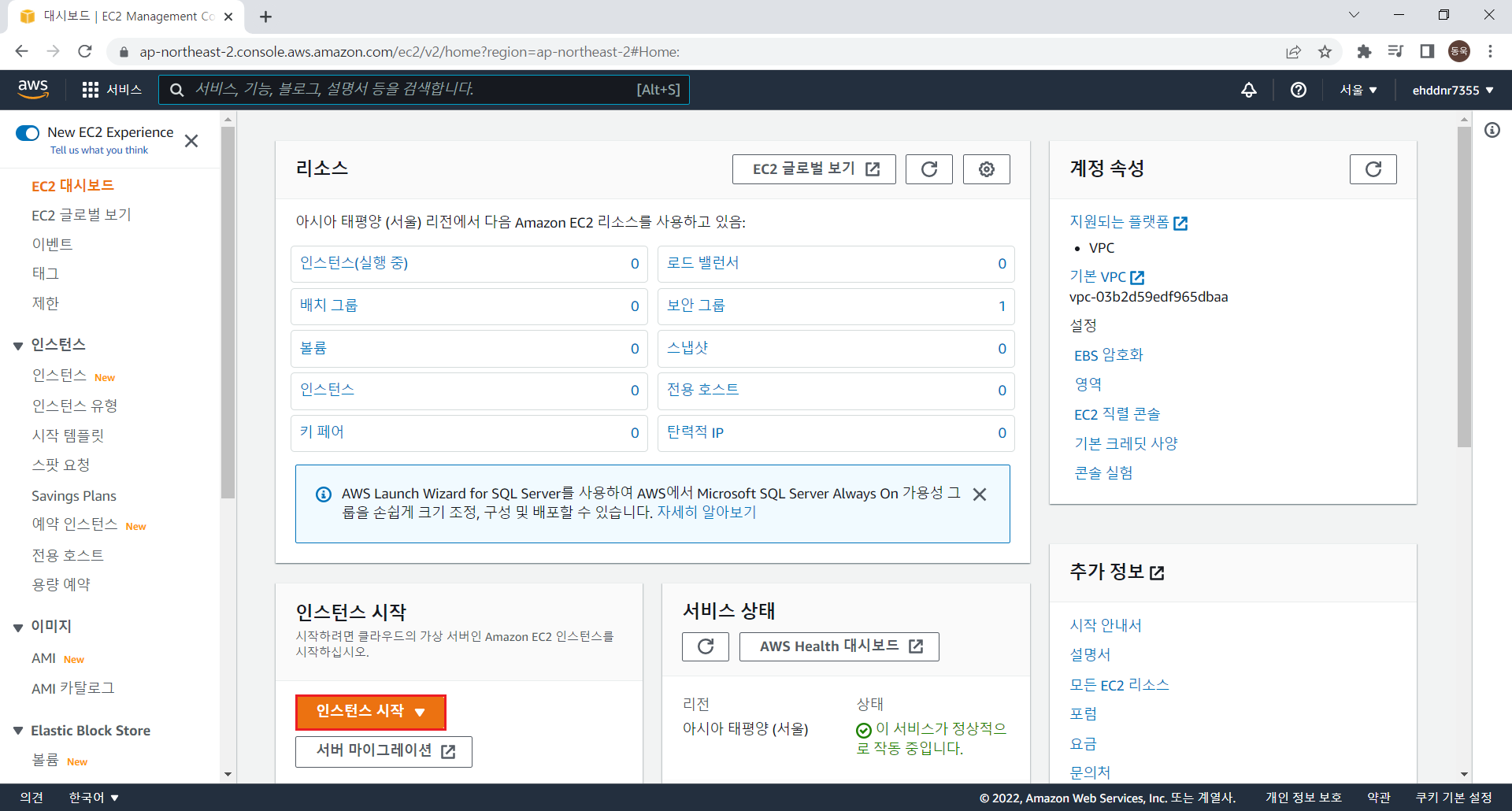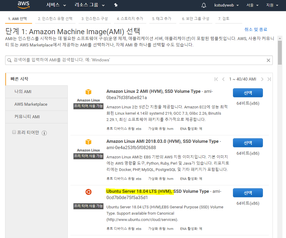 💡 인스턴스를 생성하기 전, AWS 사이트 오른쪽 상당의 Region(리전)을 Seoul로 변경하면 인스턴스를 AWS 서울 리전에 생성할 수 있습니다. US, EU 등의 리전에 인스턴스를 생성하면 인스턴스에 SSH로 접속했을 때 반응 속도가 느려질 수 있습니다.