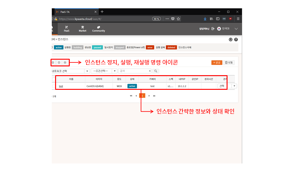 인스턴스를 생성한 후 조금 기다리면 인스턴스 상태가 running으로 바뀝니다.