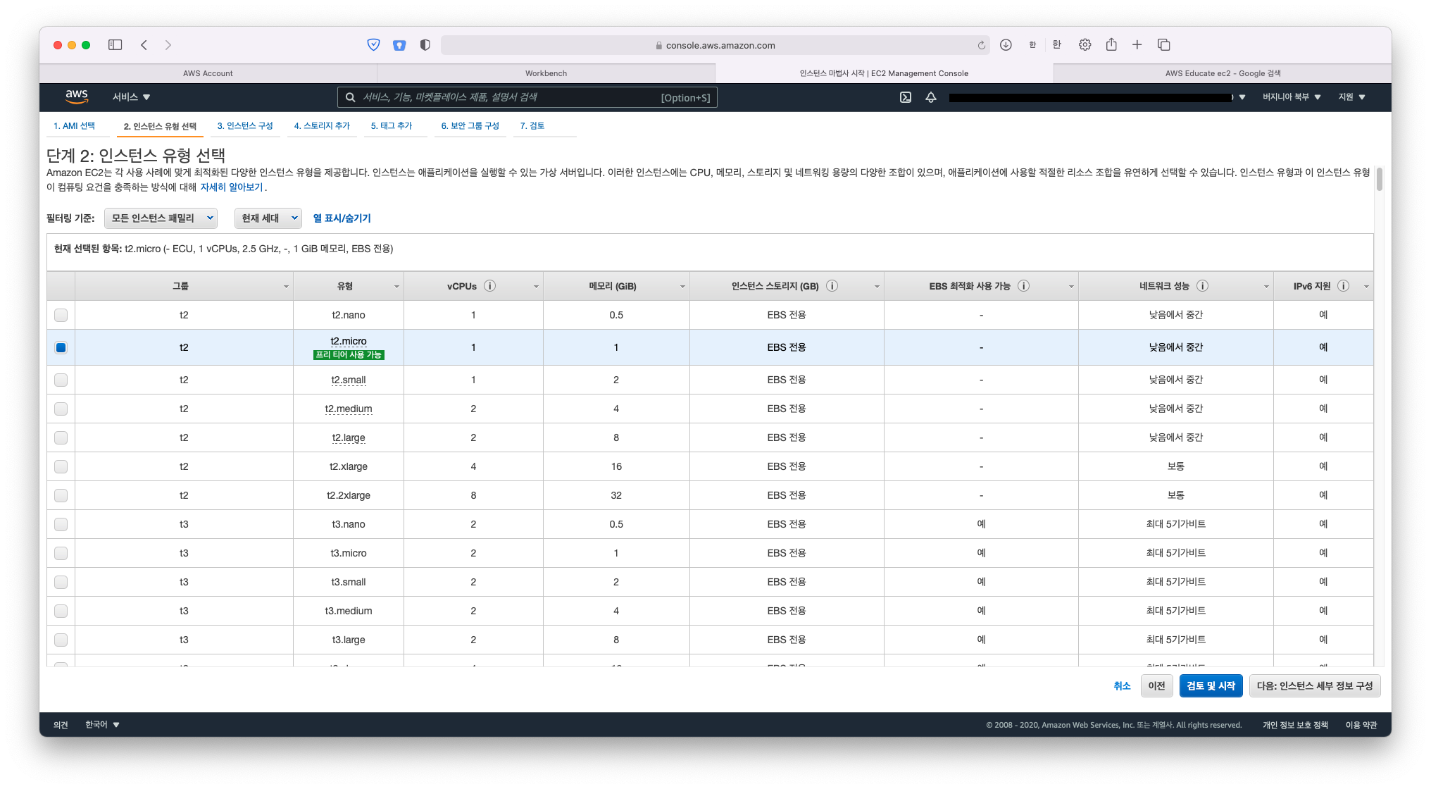 생성할 인스턴스의 성능을 선택합니다. 목록의 아래에 위치할수록 높은 성능의 인스턴스이며, 더 많은 요금을 지불해야 합니다. AWS의 프리티어를 통해 무료로 사용 가능한 t2.micro 항목을 선택합니다.