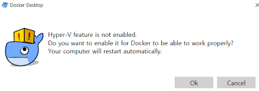 설치하고 나면 Hyper-V 기능을 활성화하기 위해 PC를 재시작합니다. PC를 재시작하고 나면 트레이 아이콘에서 도커가 작동 중인지 확인할 수 있습니다.