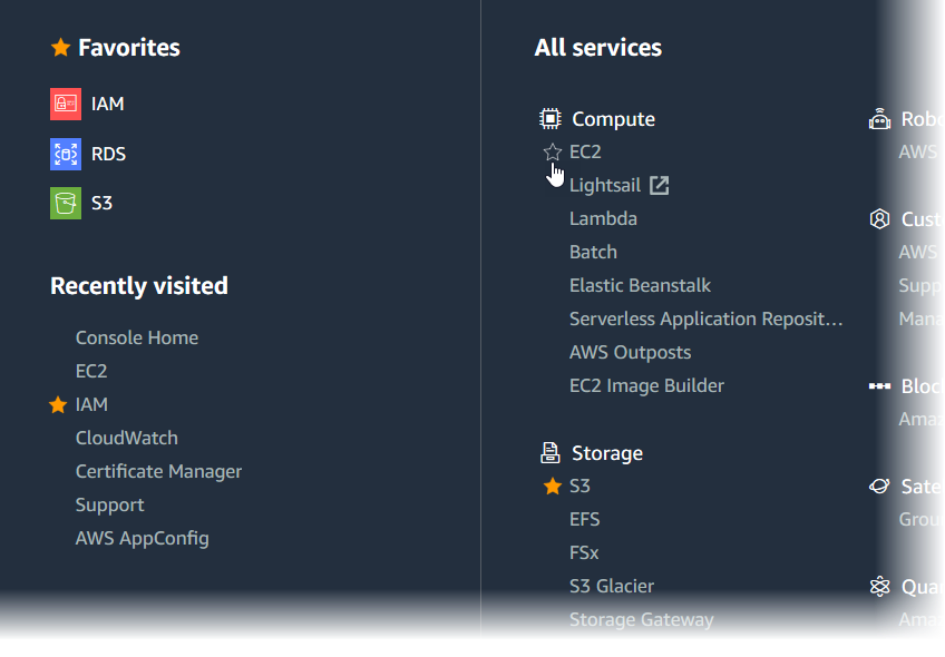 AWS 사이트에 접속해 [콘솔에 로그인] 버튼을 눌러 로그인하면 Management Console(관리 콘솔)을 볼 수 있습니다. 왼쪽 상단에 있는 컴퓨팅 항목의 [EC2]를 클릭합니다.