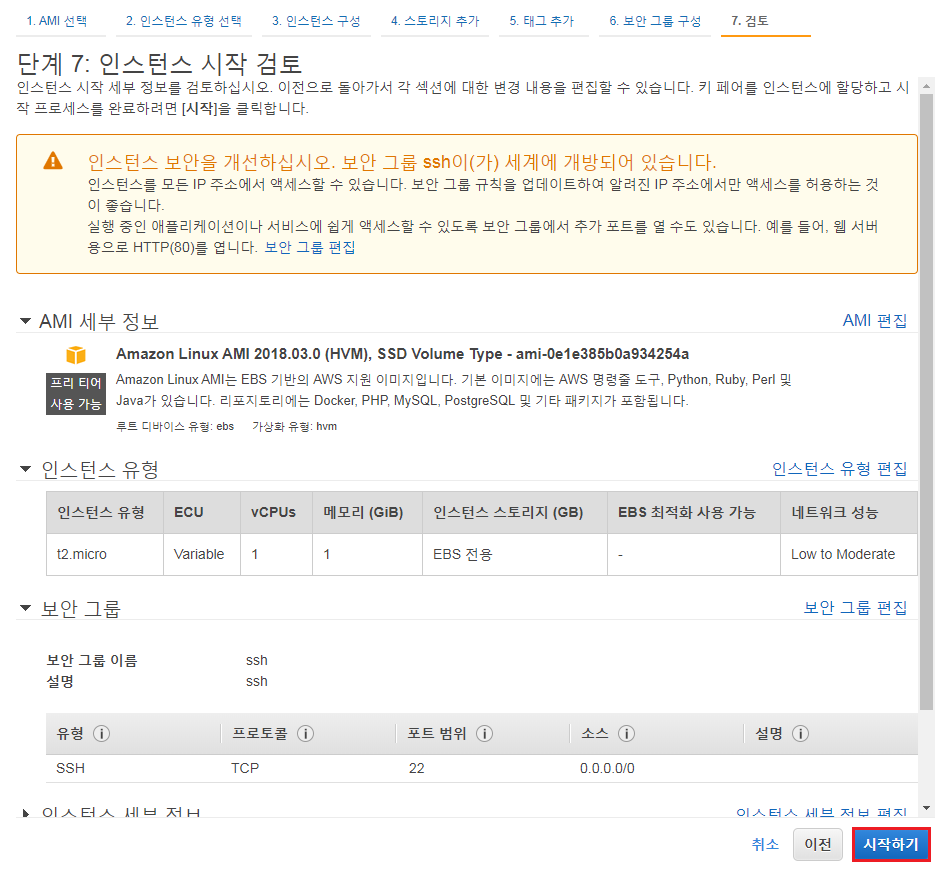 t2.micro 항목을 선택한 후 [검토 및 시작]을 클릭하면 바로 인스턴스 생성 확인 페이지로 넘어갑니다. 단, 세부 옵션을 설정하려면 [다음: 인스턴스 세부 정보 구성]을 클릭해서 설정합니다.